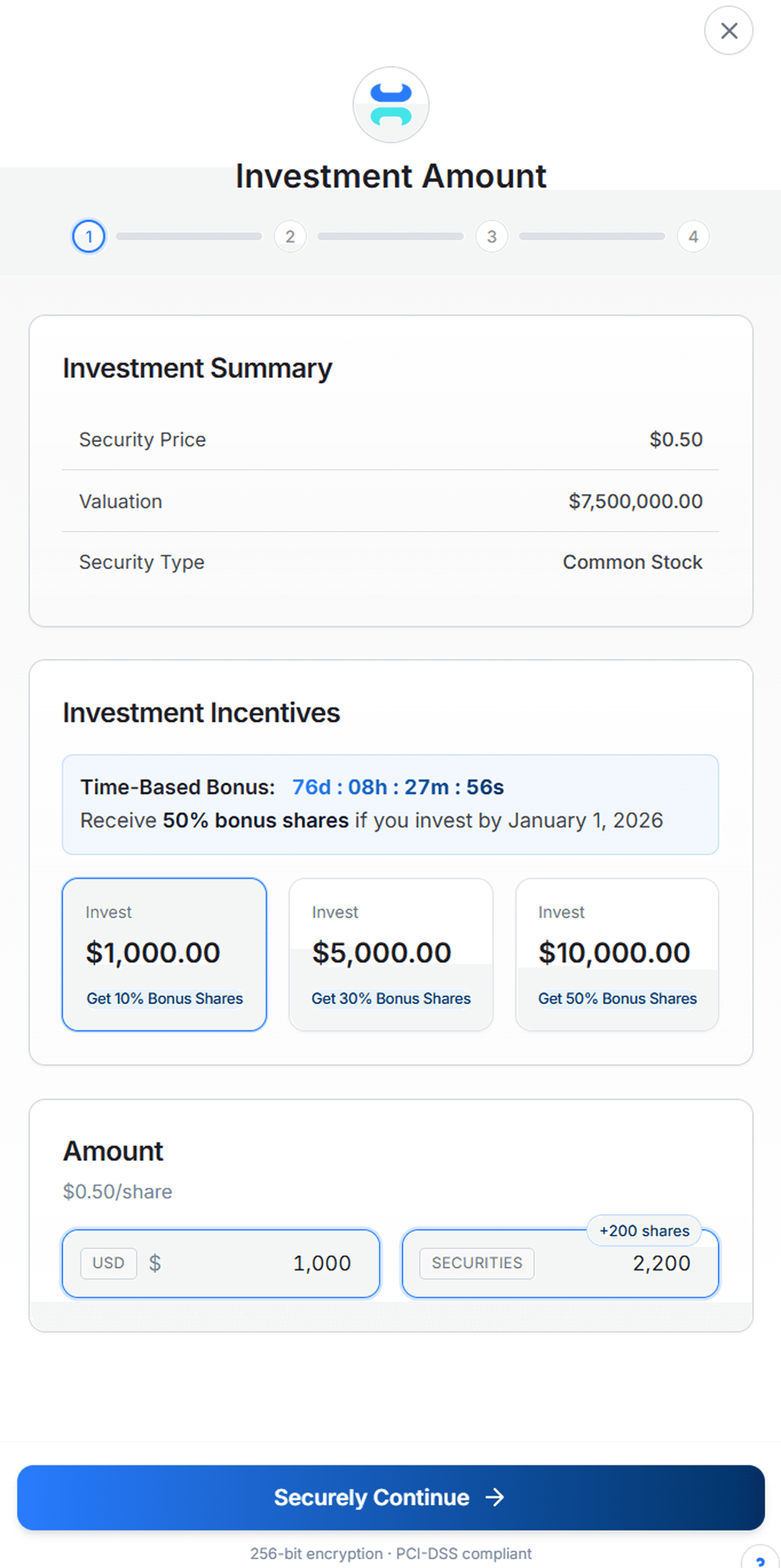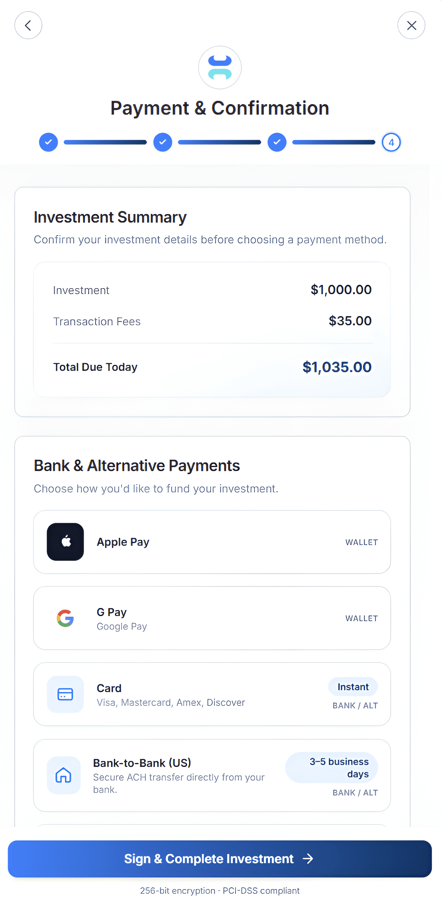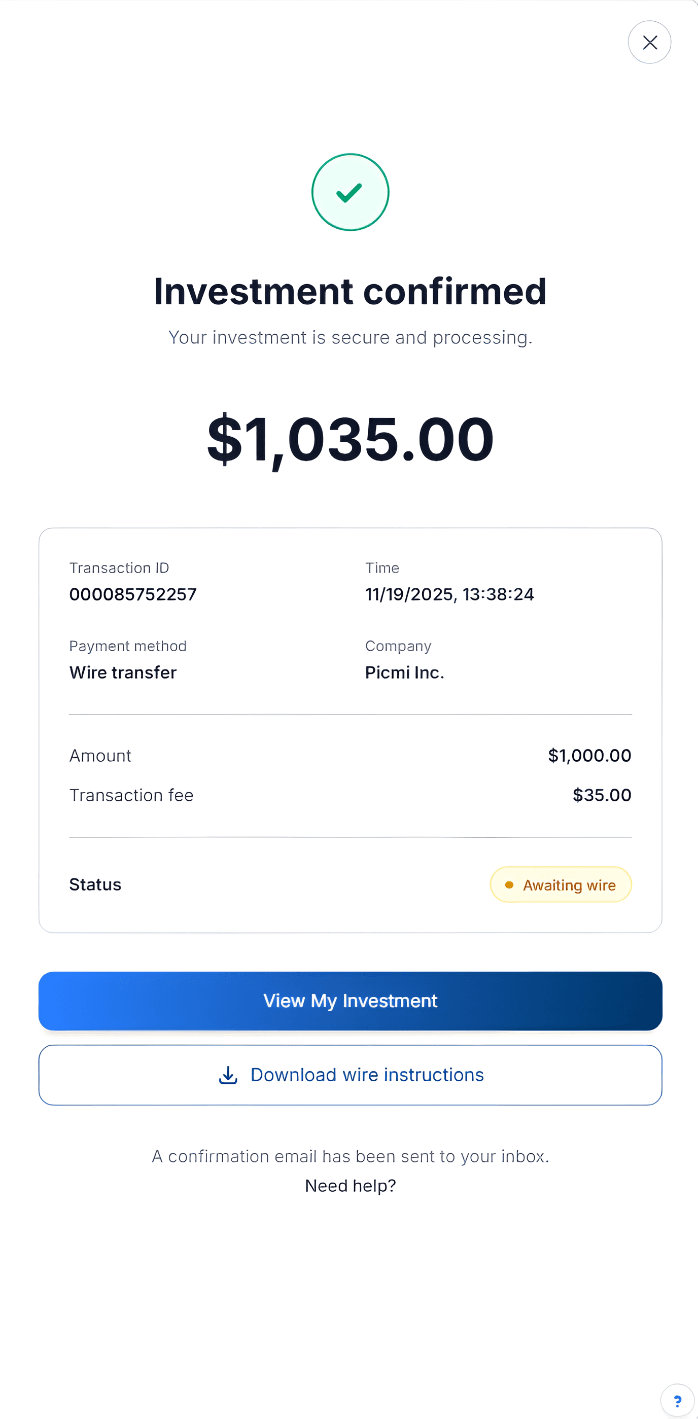 Investors seamlessly complete their investments through your company's website. Our secure and user-friendly checkout process ensures a smooth experience from start to finish.