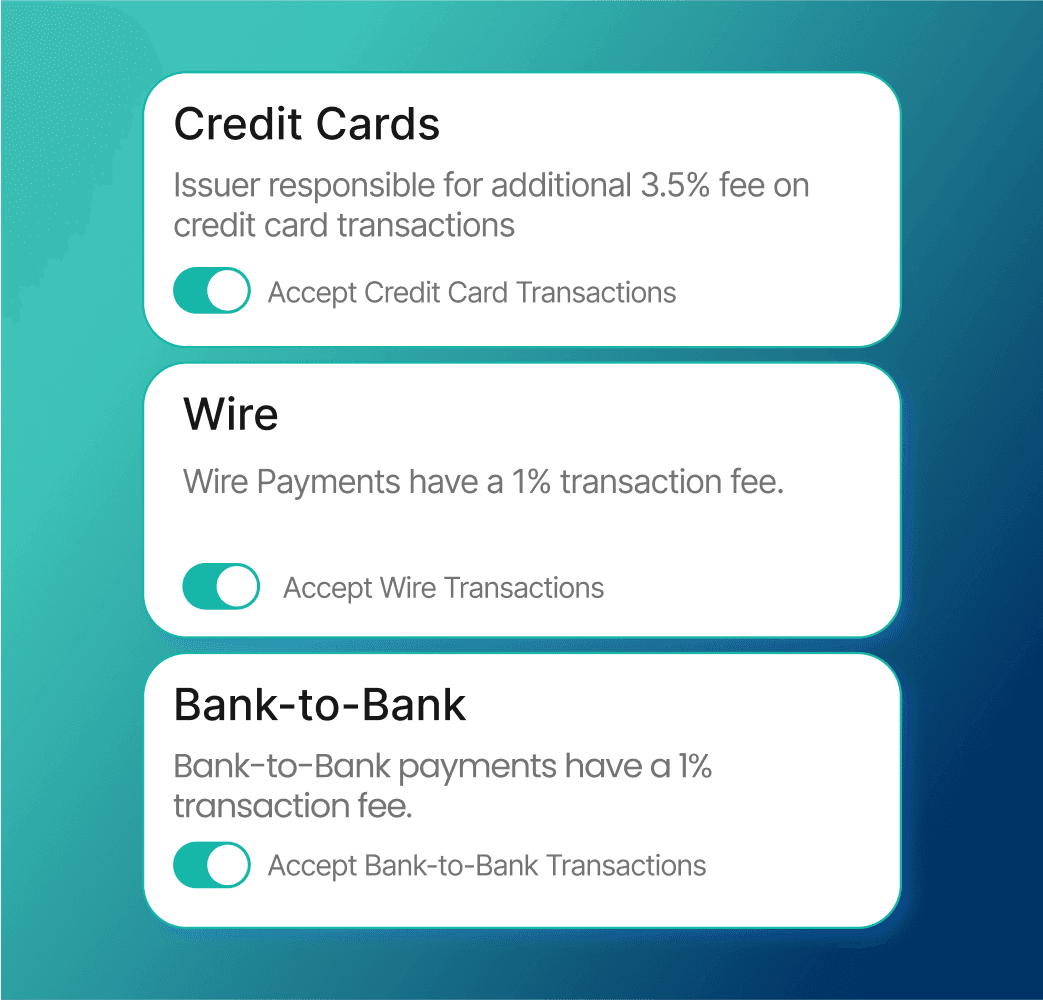 Choose from multiple payments. Choose from multiple payment options including credit cards, ACH, Wire, PayPal.